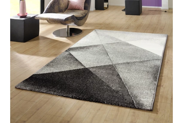 Koberec s hustým vlasem v šedé barvě s geometrickým vzorem. Rozměr 120×170 cm.