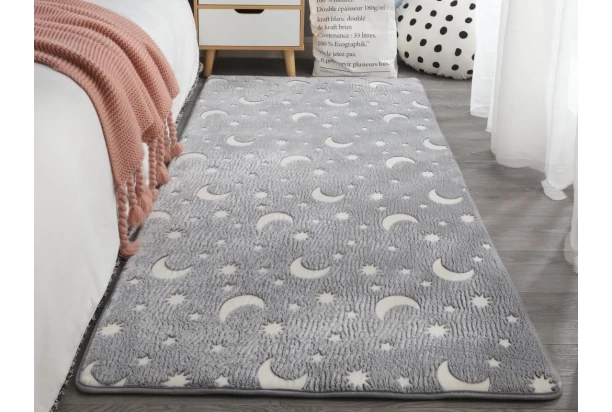 Dětský koberec v šedé barvě zaujme holky i kluky svým vzorem měsíčků, které svítí ve tmě. Měkoučký koberec příjemně zahřeje chodidla, ale hlavně rozzáří každý dětský pokojíček. Rozměr 120×160 cm.