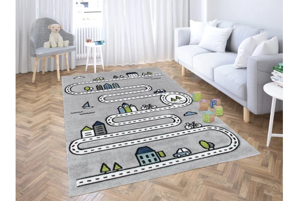 Dětský koberec v šedé barvě s motivem silnice ve městě rozzáří každý dětský pokojíček. Ulice, domy, auta a kola navodí dětem hravou a radostnou náladu. Rozměr 120×170 cm.