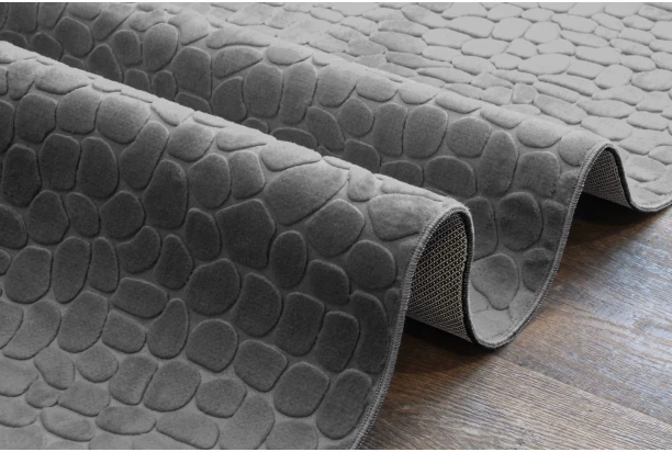 Elegantní měkký koberec v jednoduché antracitové barvě je zakončen třásněmi z lesklé nitě. Dvouúrovňové rouno vytváří 3D efekt imitující kamínky, které poskytnou příjemnou relaxační masáž při chůzi naboso. Rozměr 150×220 cm.