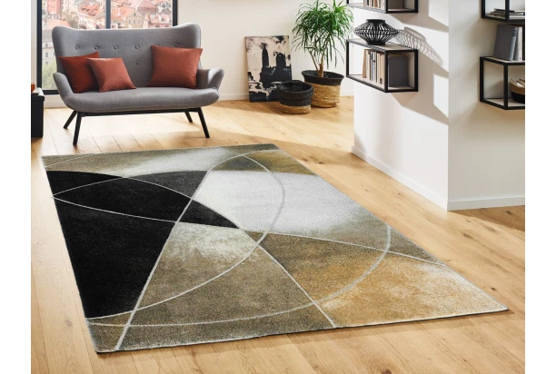 Černo-šedo-zlatý koberec o rozměru 120×170 cm v moderním stylu svým vzorem vytváří 3D efekt, který na podlaze skvěle vynikne. Díky měkkému povrchu je koberec velmi příjemný na nohy.