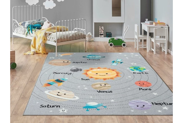 Vysoce kvalitní dětský koberec s roztomilým motivem vesmíru v šedém provedení. Barevné veselé planety vybízí děti ke hrám a koberec tak promění dětský pokoj v útulné prostředí. Zároveň se z ratolestí stanou malí astronauti, kteří poznají sluneční soustavu. Rozměr 80×150 cm.
