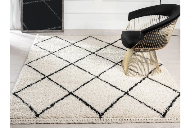 Mimořádně nadýchaný koberec s měkkým vysokým vlasem vytvoří příjemnou atmosféru v obývacím pokoji, ložnici nebo třeba v dětském pokoji. Diamantový kosočtvercový černý vzor na krémovém pozadí skvěle zapadne do skandinávského stylu bydlení, tedy i moderního a minimalistického. Rozměr 120×170 cm.