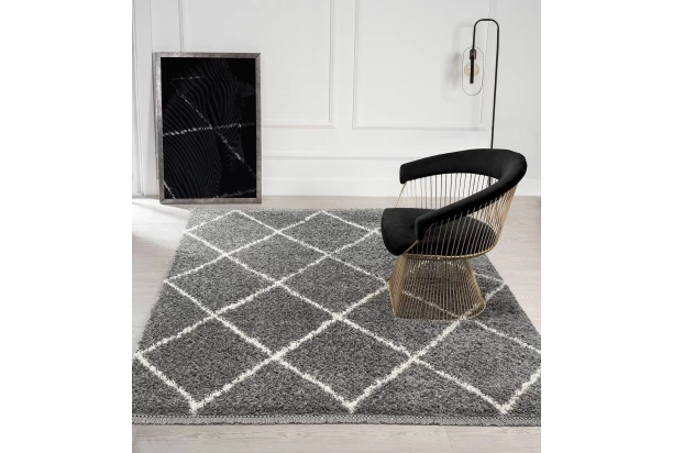 Mimořádně nadýchaný koberec s měkkým vysokým vlasem vytvoří příjemnou atmosféru v obývacím pokoji, ložnici nebo třeba v dětském pokoji. Diamantový kosočtvercový vzor na šedém pozadí skvěle zapadne do skandinávského stylu bydlení, tedy i moderního a minimalistického. Rozměr 120×170 cm.