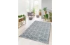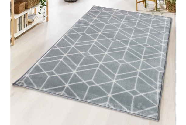 Stříbrný koberec s grafickým vzorem s nízkým vlasem je měkký a v pokojích navodí útulnou atmosféru. Rozměr 60×110 cm.
