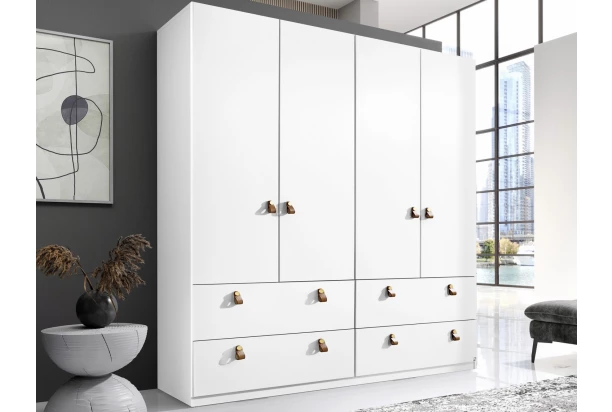 Šatní skříň z programu Quadra-Spin má celkovou šířku 181 cm a je vyrobena v bílé barvě v kombinaci se stylovými úchyty z hnědé kůže, díky kterým zaujme. Tato kvalitně zpracovaná skříň obsahuje 4 otočné dveře a 4 objemné zásuvky pro praktické ukládání drobného prádla. Vnitřní části skříně lze navíc libovolně doplnit dalšími policemi, díky kterým si vnitřní prostor přizpůsobíte podle svým potřeb.