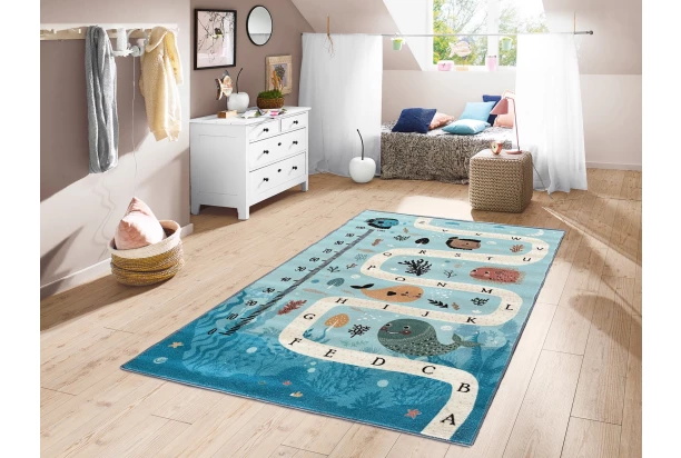 Dětský modrý koberec o rozměru 80×150 cm s motivem mořského světa je nejen krásný, ale i vzdělávací. Vaše dítě se může hravou formou naučit abecedu i čísla. Veselé rybičky se vším rádi pomohou.