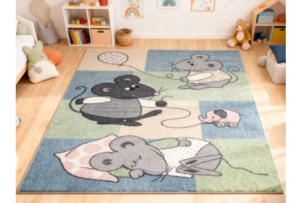 Tento měkký a pohodlný koberec je ideální volbou pro dětský pokojíček. Veselý motiv myšek v kombinaci s hravými barvami přináší do interiéru útulnost a radostnou atmosféru. Rozměr 120×170 cm.