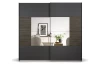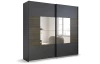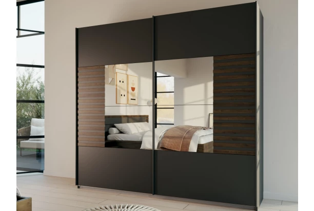 Šatní skříň se zrcadlem z kolekce Barea – nábytek do ložnice v moderním lamelovém designu nabízí praktičnost i kvalitní zpracování. Tento trendový nábytek v kombinaci tmavě šedých ploch s dubovým dřevodekorem vytváří stylové akcenty. Posuvné dveře skříně umožňují snadný přístup do vnitřního prostoru a doplňují je zrcadla, která opticky zvětší prostor uvnitř místnosti. Skříň o šířce 226 cm má dva vnitřní bloky, které můžete libovolně doplnit dalšími policemi. Vnější konstrukci skříně lze navíc doplnit okrasným paspartovým rámem.