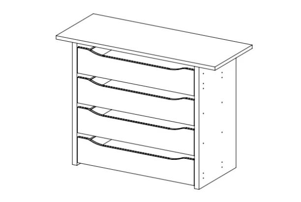 Vnitřní 4-zásuvkový element o šířce 111 cm pro umístění do vnitřního prostoru šatní skříně. Pro umístění do vnitřního skříňového bloku o šířce cca 112,5 cm. Praktický doplněk pro přehledné ukládání drobného prádla uvnitř skříně.