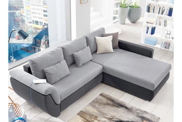 Zaoblená rohová sedací souprava s příjemně měkkými polštáři pro útulnou domácí pohodu. Díky funkci rozkladu se sedačka snadno promění v lůžko pro příležitostné spaní. Otoman můžete univerzálně smontovat na pravou nebo levou stranu – najde tak snadno místo v jakékoliv místnosti. V kombinaci šedá/světle šedá tkanina.