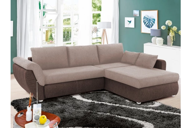 Zaoblená rohová sedací souprava s příjemně měkkými polštáři pro útulnou domácí pohodu. Díky funkci rozkladu se sedačka snadno promění v lůžko pro příležitostné spaní. Otoman můžete univerzálně smontovat na pravou nebo levou stranu – najde tak snadno místo v jakékoliv místnosti. V kombinaci hnědá/béžová tkanina.