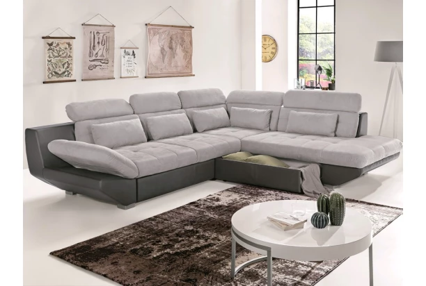Prostorná rohová sedací souprava Eternity má extravagantní design, díky tomu dokonale doplní moderní byt. Prostorné ležérní sezení doplňují polohovatelné zádové opěrky, které lze libovolně nastavovat. Sedačka je očalouněna kombinací šedé ekokůže a světle šedé látky. Vybavena funkcí s rozkladem na lůžko a praktickou úložnou zásuvkou v pravém otomanu.