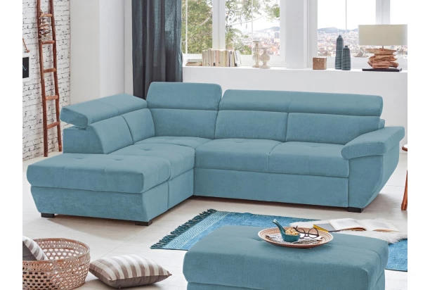 Nechte se inspirovat zajímavým designem tvarů rohové sedačky Speedway, která v interieru jen tak nezevšední. Očalouněna látkou v odstínu azurově modrá a s levým otomanem. Oceníte komfortně měkký sedák i polohovatelné zádové opěrky – snadno si tak můžete přizpůsobit styl sezení podle Vaší individuální potřeby. Včetně funkce rozkladu a úložného prostoru.
