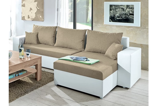 Rohová sedací souprava v kompaktních rozměrech lze univerzálně sestavit jako pravý/levý roh. Snadno ji tak umístíte do jakékoliv místnosti. Potažena kombinací bílé ekokůže a béžové látky.