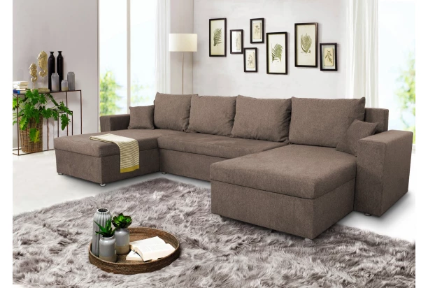 Sedací souprava ve tvaru U je oblíbená pro svou praktičnost, prostornost a příznivou cenu. Nabízí měkké opěrné polštáře, úložný prostor i funkci rozkladu na lůžko. Očalouněna tkaninou v barvě oříškově hnědá.