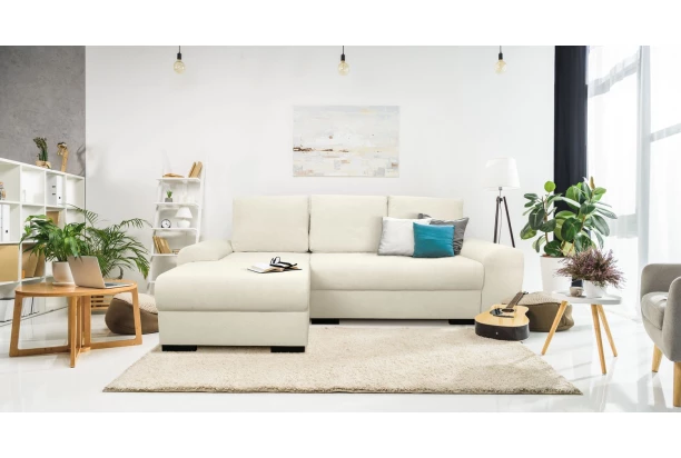 Rohová sedačka se zaoblenými tvary, velkými opěrnými polštáři, úložným místem a rozkladem. Sedací souprava může být univerzálně smontována jako pravý nebo levý roh. Očalouněna jemně strukturovanou látkou v barvě béžová.
