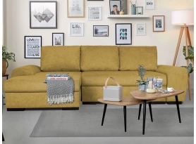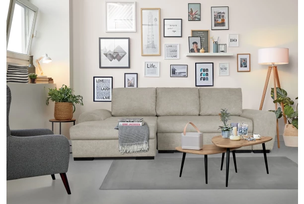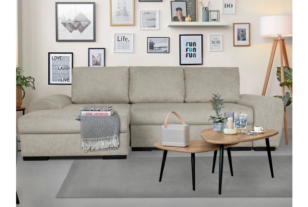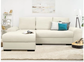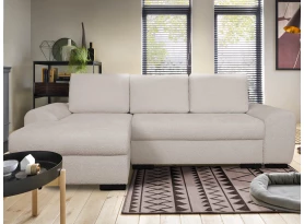 Béžová rohová sedačka se zaoblenými tvary, velkými opěrnými polštáři, úložným místem a rozkladem. Sedací souprava může být univerzálně smontována jako pravý nebo levý roh. Očalouněna příjemně měkkou látkou v béžovém odstínu.