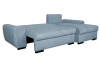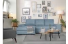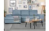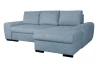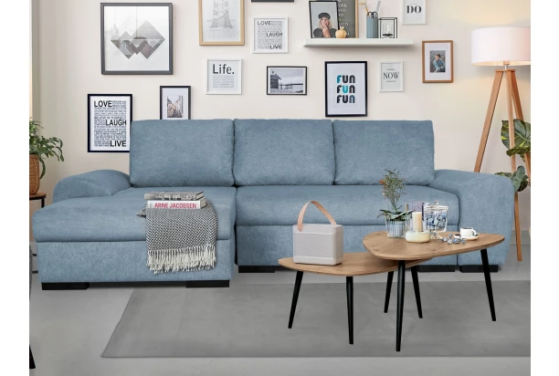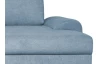 Modrá rohová sedačka se zaoblenými tvary, velkými opěrnými polštáři, úložným místem a rozkladem. Sedací souprava může být univerzálně smontována jako pravý nebo levý roh. Očalouněna příjemně měkkou látkou v denimově modrém odstínu.