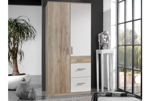 Šatní skříň o šířce 90 cm z programu Cariba v kombinaci dekoru dub san remo a bílé barvy. Svým univerzálním stylem je vhodná pro vybavená ložnice, šatny i dětského pokoje.