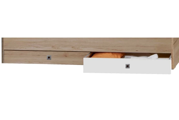 Sada úložných zásuvek pod postel z programu Cariba v kombinaci dekoru dub san remo a bílé barvy. Maximálně univerzální konstrukce na kolečkách – stačí zasunout pod jakoukoliv postel.