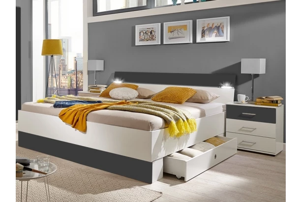 Postel s nočními stolky o rozměru lůžka 180×200 cm si oblíbíte především pro její praktičnost: zabudované osvětlení využijete při večerním čtení a úložné zásuvky pro uschování ložního prádla. Vyrobena v kombinaci bílá/grafitová.