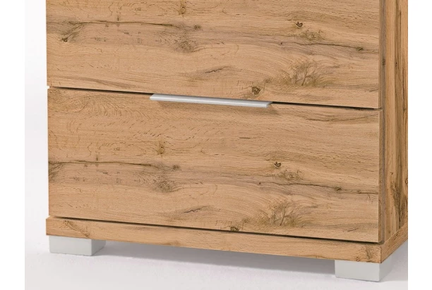 Moderní noční stolek s komfortně vyšší konstrukcí se ideálně hodí k vyššímu lůžku. Vyroben v dekoru divoký dub wotan.