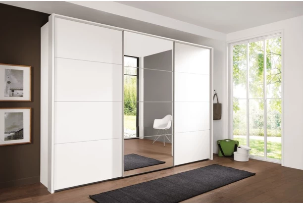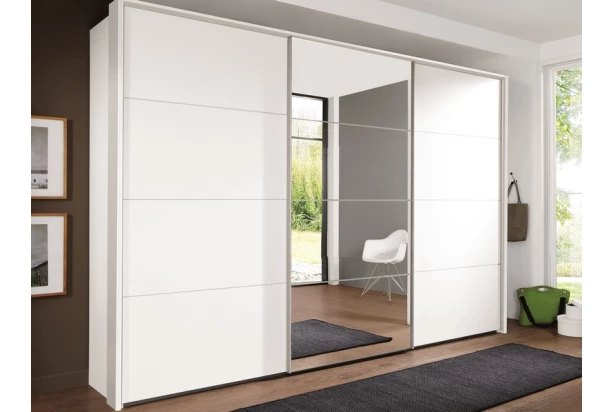 Velká šatní skříň se 3 posuvnými dveřmi a o celkové šířce 270 cm. Vyrobena v celobílém provedení se středovým zrcadlem. Nabízí dostatek úložných prostor pro početné ošacení, navíc lze doplnit o další vnitřní police.