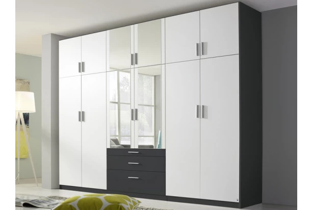 Extra velká šatní skříň o šířce 271 cm a navíc zvětšené výšce s přehledným uspořádáním vnitřních úložných prostor. Obsahuje celkem 12 dveří, vnitřní police, zrcadla i 3 zásuvky. V kombinaci tmavá šedá/bílá.