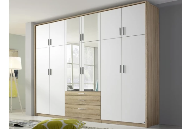 Extra velká šatní skříň o šířce 271 cm a navíc zvětšené výšce s přehledným uspořádáním vnitřních úložných prostor. Obsahuje celkem 12 dveří, vnitřní police, zrcadla i 3 zásuvky. V kombinaci dub sonoma/bílá.