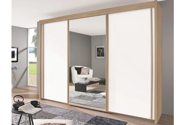 Prostorná a velmi oblíbená šatní skříň s kvalitní konstrukcí o šířce 250 cm. V kombinaci dub sonoma s bílými plochami. Vnitřní prostory přístupné přes 3 komfortní posuvné dveře. Velké zrcadlo uprostřed opticky zvětšuje okolní prostor v místnosti.