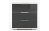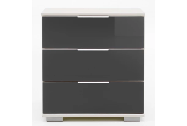Vysoký noční stolek z programu Easy plus nabízí 3 prostorné zásuvky nad sebou. V kombinaci bílé barvy a šedého skla.