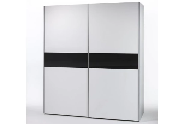 Bílé plochy skříně kontrastně zvýrazňuje vodorovný pás černého dekoru na dvou posuvných dveřích. Celková šířka 172 cm.