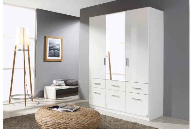Skříň v bílém vysocelesklém provedení působí velmi luxusně. Minimalistický design v praktické kombinaci 3 dveří a 6 zásuvek.