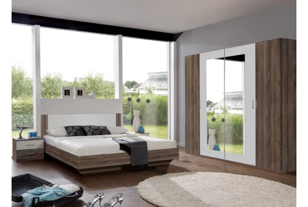 Sestava kompletní ložnice v kombinaci dekoru dub bahenní a bílé barvy vytváří moderní a zároveň příjemně působící kontrast.