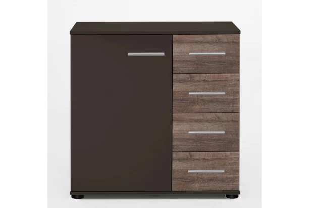 Praktická komoda se zásuvkami v kombinaci grafitové barvy a dekoru bahenní dub vytváří moderní a zároveň příjemně působící kontrast.