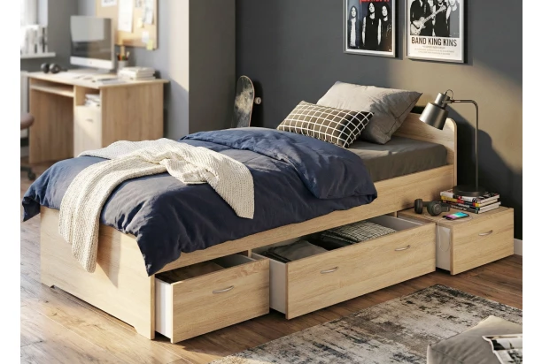 Jednolůžková postel v dekoru dub sonoma je vhodná jak pro děti, tak pro dospělé. Vybavena 3 praktickými úložnými zásuvkami v dolní části, které můžete univerzálně smontovat na pravou nebo levou boční stranu postele.