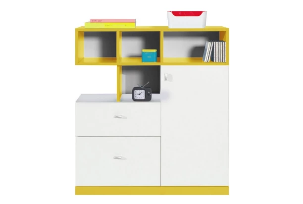 Program nábytku Mobi má nápaditě řešenou konstrukci v bílo-žluté kombinaci barev. Hodí se pro zařizování jakéhokoliv pokoje. Komoda.