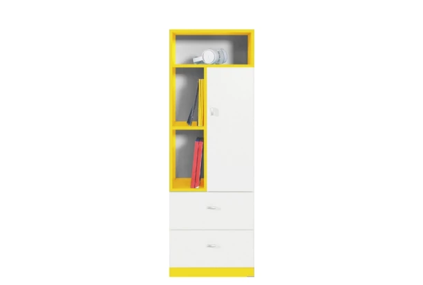 Program nábytku Mobi má nápaditě řešenou konstrukci v bílo-žluté kombinaci barev. Hodí se pro zařizování jakéhokoliv pokoje. Skříňka s regálem.