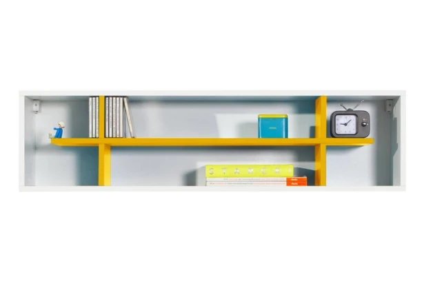 Program nábytku Mobi má nápaditě řešenou konstrukci v bílo-žluté kombinaci barev. Hodí se pro zařizování jakéhokoliv pokoje. Závěsný regál.