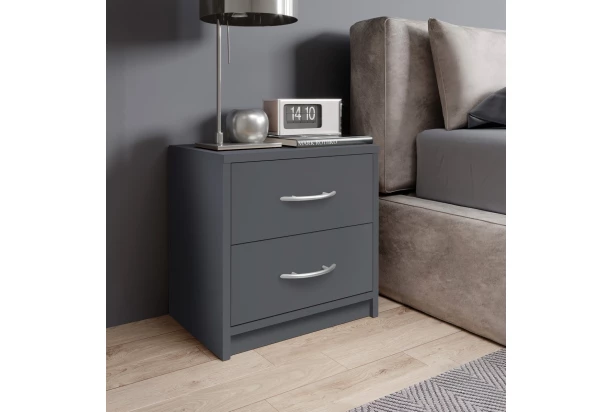 Jednoduchý noční stolek v barvě šedý grafit se 2 zásuvkami. Univerzální do každé ložnice nebo dětského pokoje.