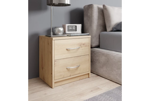 Jednoduchý noční stolek v dekoru dub artisan se 2 zásuvkami. Univerzální do každé ložnice nebo dětského pokoje.