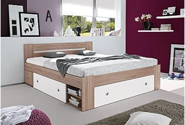 Maximálně praktická postel s nočními stolky, úložnými zásuvkami a bočními regály je ideální nejen do malého prostoru. Plocha lůžka 140×200 cm, v kombinaci dekoru dub sonoma/bílá.