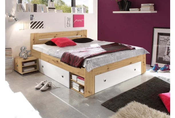 Maximálně praktická postel s nočními stolky, úložnými zásuvkami a bočními regály je ideální nejen do malého prostoru. Plocha lůžka 140×200 cm, v kombinaci dekoru dub artisan/bílá.