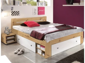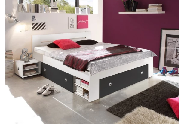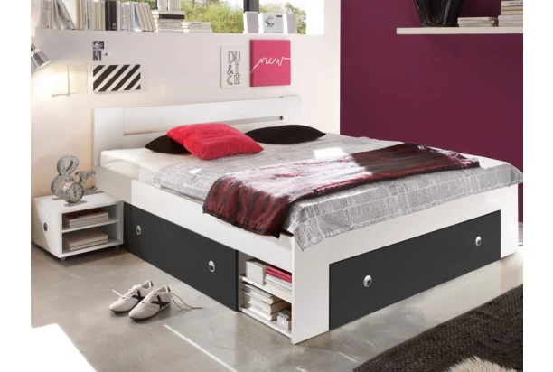 Maximálně praktická postel s nočními stolky, úložnými zásuvkami a bočními regály je ideální nejen do malého prostoru. Plocha lůžka 140×200 cm, v kombinaci dekoru bílá/grafit.