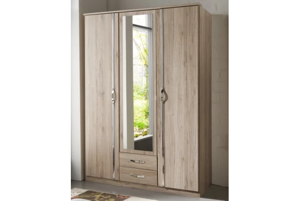 - svislé linie chromově lesklých proužků navazují na zaoblené úchyty a moderně zvýrazňují dubové plochy šatní skříně