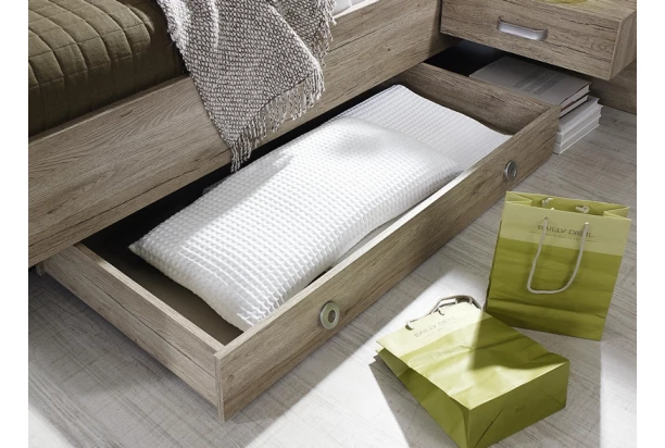Praktickou úložnou zásuvku na kolečkách snadno zasunete pod postel. Vyrobena v dekoru dub San Remo.