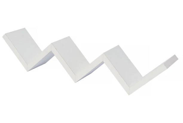 Bílá police na stěnu může být zavěšena šikmo anebo do kaskádovitého tvaru. Poslouží pro odkládání knížek, dekorací anebo jakýchkoliv drobností.