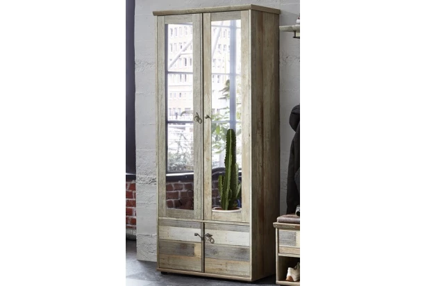 Šatní skříň ze stylové kolekce Bonanza – povrchy imitující vintage optiku oprýskaných dřevěných latí vnesou do vašeho interieru originalitu a zároveň inspiraci k zařízení opravdu stylového bytu. Díky vnitřním policím lze využít nejen na šaty, ale případně i jako botník.