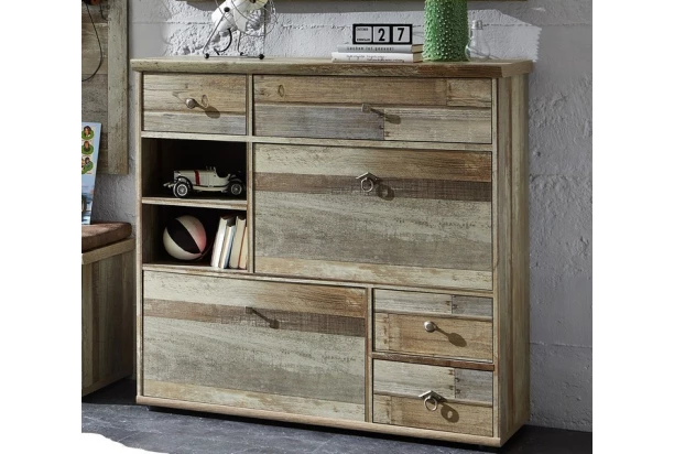 Úložná komoda nebo také botník ze stylové kolekce Bonanza – povrchy imitující vintage optiku oprýskaných dřevěných latí vnesou do vašeho interieru originalitu a zároveň inspiraci k zařízení opravdu stylového bytu. Lze využít v předsíni i obývacím pokoji.